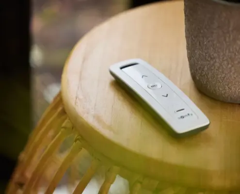 W przypadku sterowania elektronicznego pergoli, wszystkie funkcje mogą być obsługiwane za pomocą jednego pilota firmy Somfy. Możemy zdalnie otwierać i zamykać dach, opuszczać i podnosić boczne ekrany i sterować oświetleniem LED.