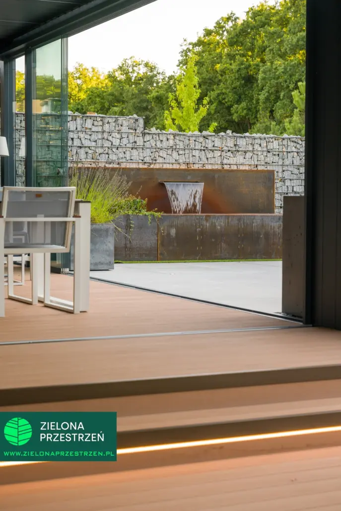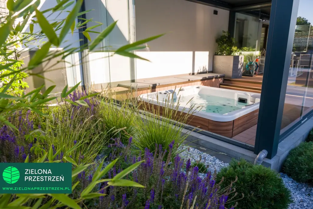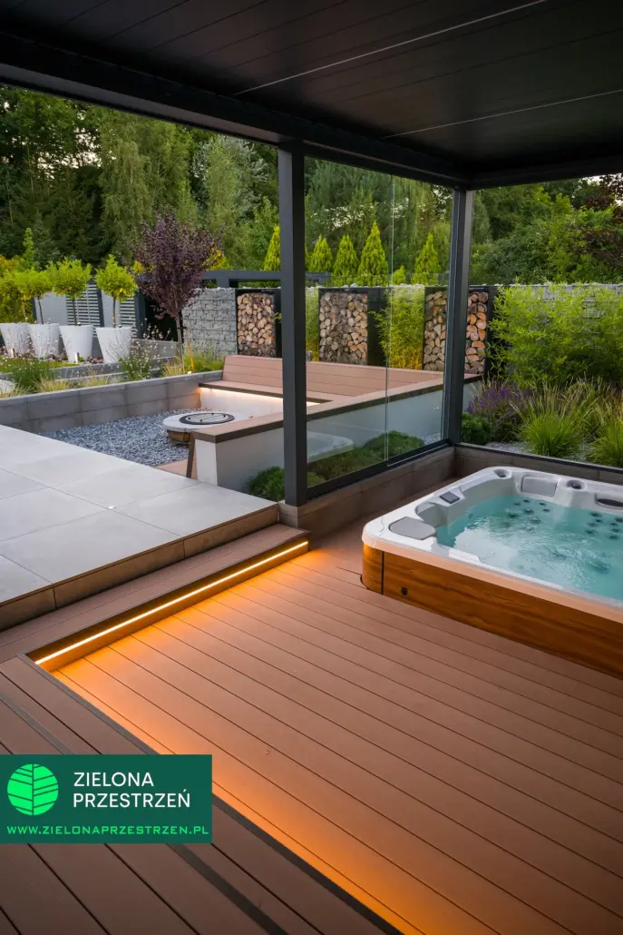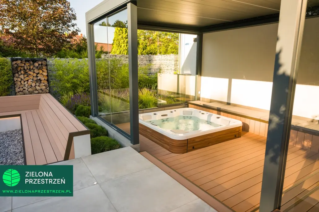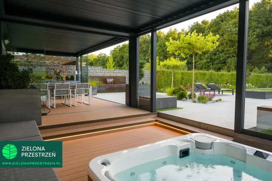 To jedna z tych realizacji, w których zadaszenie nie jest jedynie osłoną, a staje się istotnym elementem całej koncepcji ogrodu.