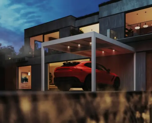 Carport Pergoletta to aluminiowe zadaszenie ze stałym dachem, które doskonale sprawdzi się jako stylowa osłona samochodowa. Jej możliwości są nieograniczone, a dzięki swojej budowie pozwala stworzyć strefę wolną od deszczu.
