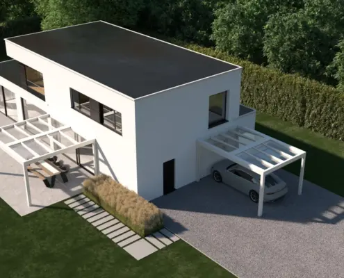 Zadaszenie Carport Pergoletta ze stałym dachem montujemy zawsze przy fasadzie budynku.