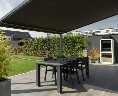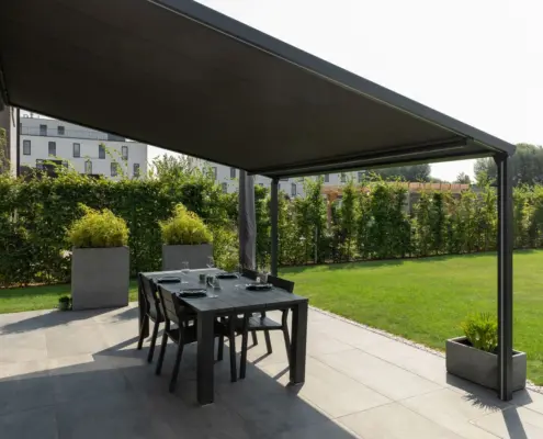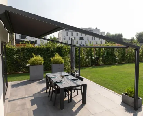 Konstrukcję pergolę LANTANA możemy zamontować przy fasadzie dowolnego budynku. Dzięki opcji całkowitego składania dachu, pomieszczenia bezpośrednio z nią sąsiadujące pozostają dobrze doświetlone.