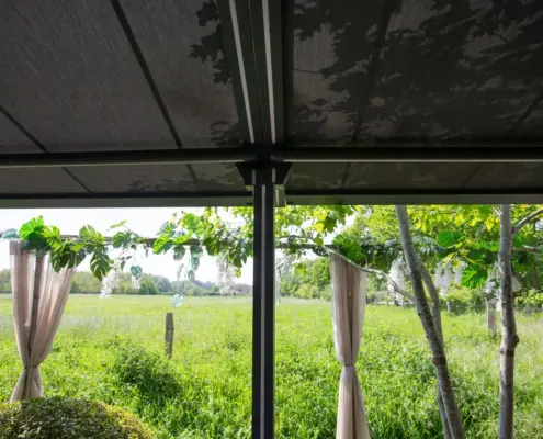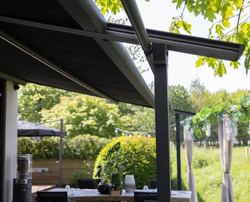 Składany dach pergoli LANTANA pozwala osłonić się przed nadmiernym słońcem, a także cieszyć wypoczynkiem na tarasie podczas deszczu. Możemy nim swobodnie sterować, ustawiając w dowolnej pozycji.